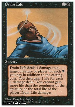 Card Text: Drain Life deals 1 damage to a target creature or player for each <B> you pay in addition to the casting cost. You then gain 1 life for each 1 damage dealt. You cannot gain more life than the toughness of the creature or the total life of the player Drain Life damages.
