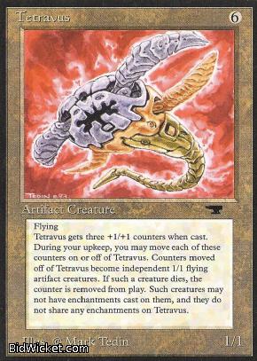 Card Text: Flying. When Tetravus comes into play, put three +1/+1 counters on it. During your upkeep, you may move each of these counters on or off of Tetravus, regardless of who controls them. Counters that are removed become Tetravite tokens. Treat these tokens as 1/1 artifact creatures with flying. These creatures cannot have enchantments played on them and do not share any enchantments on Tetravus.