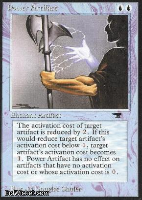 Card Text: The activation cost of target artifact is reduced by <2>. If this would reduce target artifact's activation cost below <1>, target artifact's activation cost becomes <1>. Power Artifact has no effect on artifacts that have no activation cost or whose activation cost is <0>.