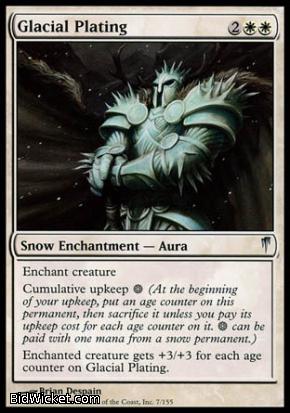 Card Text: Enchant creature Cumulative upkeep oSi (At the beginning of your upkeep, put an age counter on this permanent, then sacrifice it unless you pay its upkeep cost for each age counter on it. oSi can be paid with one mana from a snow permanent.) Enchanted creature gets +3/+3 for each age counter on Glacial Plating.