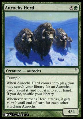 Card Text: Trample When Aurochs Herd comes into play, you may search your library for an Aurochs card, reveal it, and put it into your hand. If you do, shuffle your library. Whenever Aurochs Herd attacks, it gets +1/+0 until end of turn for each other attacking Aurochs.