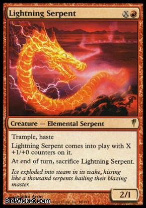 Card Text: Trample, haste Lightning Serpent comes into play with X +1/+0 counters on it. At end of turn, sacrifice Lightning Serpent.