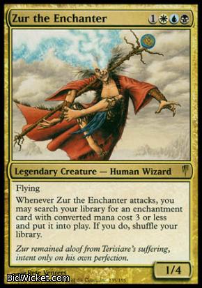 Card Text: Flying Whenever Zur the Enchanter attacks, you may search your library for an enchantment card with converted mana cost 3 or less and put it into play. If you do, shuffle your library.