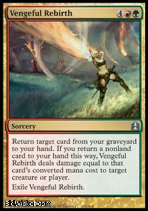 Card Text: Return target card from your graveyard to your hand. If you return a nonland card to your hand this way, Vengeful Rebirth deals damage equal to that card's converted mana cost to target creature or player.
