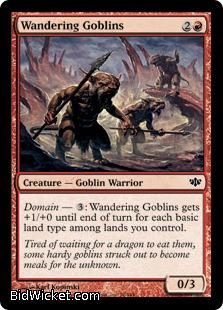 Card Text: Domain - 3: Wandering Goblins gets +1/+0 until end of turn for each basic land type among lands you control.