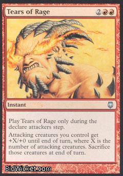Card Text: Play Tears of Rage only during the declare attackers step. Attacking creatures you control get +X/+0 until end of turn, where X is the number of attacking creatures. Sacrifice those creatures at end of turn.