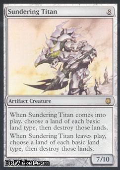 Card Text: When Sundering Titan comes into play, choose a land of each basic land type, then destroy those lands. When Sundering Titan leaves play, choose a land of each basic land type, then destroy those lands.