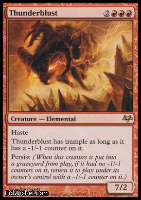 Card Text: Haste Thunderblust has trample as long as it has a -1/-1 counter on it. Persist (When this creature is put into a graveyard from play, if it had no -1/-1 counters on it, return it to play under its owner's control with a -1/-1 counter on it.)