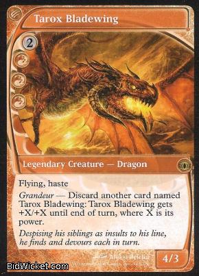 Card Text: Flying, haste Grandeur - Discard another card named Tarox Bladewing: Tarox Bladewing gets +X/+X until end of turn, where X is its power.