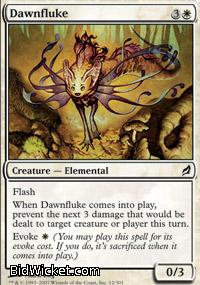 Card Text: Flash When Dawnfluke comes into play, prevent the next 3 damage that would be dealt to target creature or player this turn. Evoke W (You may play this spell for its evoke cost. If you do, it's sacrificed when it comes into play.)