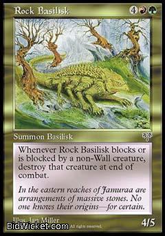 Card Text: Whenever Rock Basilisk blocks or is blocked by a non-wall creature, destroy that creature at end of combat.