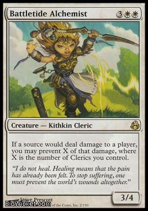 Card Text: If a source would deal damage to a player, you may prevent X of that damage, where X is the number of Clerics you control.