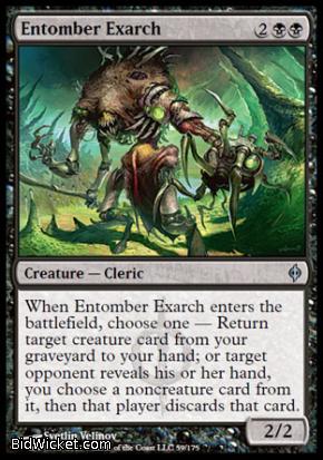 Card Text: When Entomber Exarch enters the battlefield, choose one - Return target creature card from your graveyard to your hand; or target opponent reveals his or her hand, you choose a noncreature card from it, then that player discards that card.
