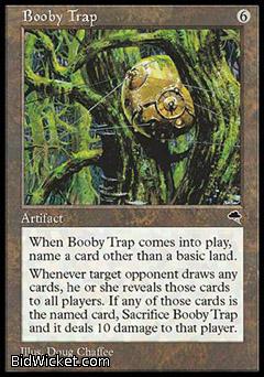 Card Text: When Booby Trap comes into play, name a card other than a basic land. Whenever taget opponent draws any cards, he or she reveals those cards to all players. If any of those cards is the named card, Sacrifice Booby Trap and it deals 10 damage to that player.