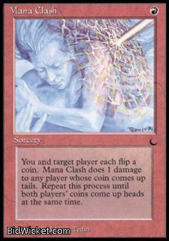 Card Text: You and target opponent each flip a coin. Mana Clash deals 1 damage to any player whose coin comes up tails. Repeat this process until both players' coins come up heads at the same time.
