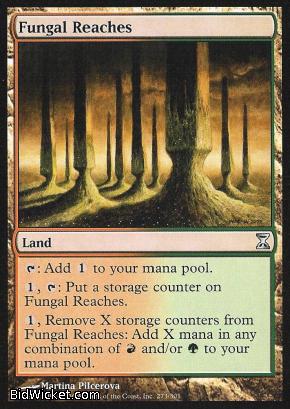 Card Text: T Add 1 to your mana pool. 1, T Put a storage counter on Fungal Reaches. 1, Remove X storage counters from Fungal Reaches: Add X mana in any combination of R and/or G to your mana pool.