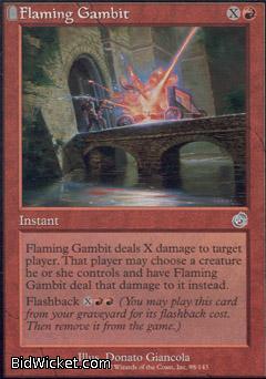 Card Text: Flaming Gambit deals X damage to target player. That player may choose a creature he or she controls and have Flaming Gambit deal that damage to it instead. Flashback XRR