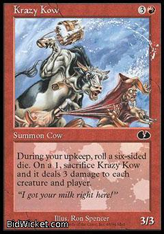 Card Text: During your upkeep, roll a six-sided die. On a 1, sacrifice Krazy Kow and it deals 3 damage to each creature and player.