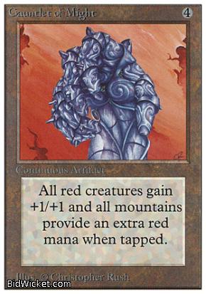 Card Text: All red creatures gain +1/+1, and all mountains provide an extra red mana when tapped.