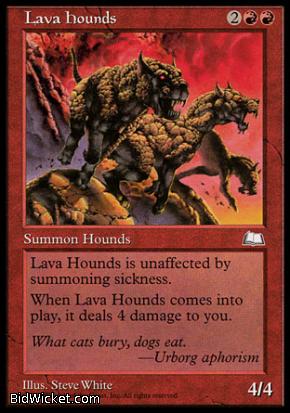 Card Text: Lava Hounds is unaffected by summoning sickness. When Lava Hounds comes into play, it deals 4 damage to you.